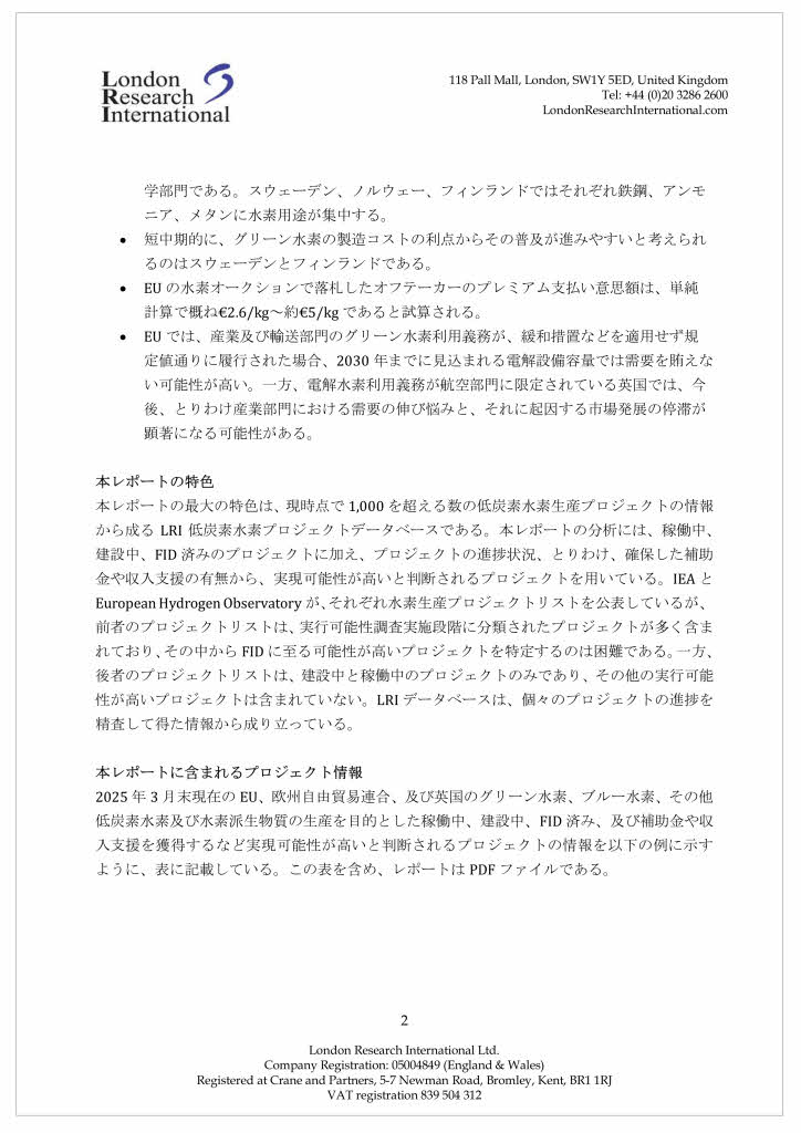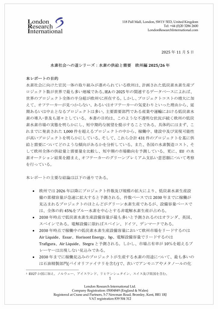 London Research Internationalはこのほど、調査レポート「水素の供給と需要 欧州編2025/26年」(日本語版)を発行しました。