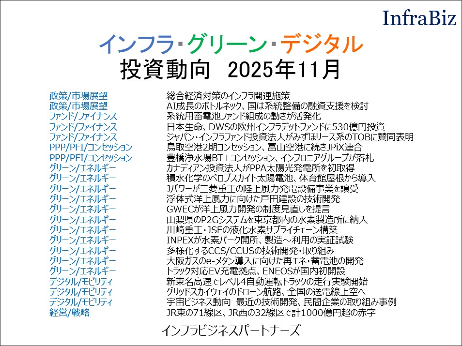 「インフラ・グリーン・デジタル投資動向」は、インフラ投資・運用戦略を立案・検証するための月次レポートです。政策/市場展望、グリーン/エネルギー、デジタル/モビリティ、ファンド/ファイナンス、PPP/PFI/コンセッション、海外/グローバル――など、分野別に重要な出来事を整理しました。
