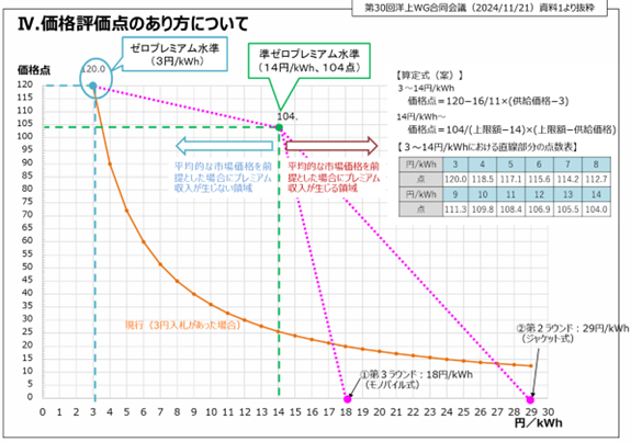 また、「適切な供給価格での入札が実施されるための価格点(120点満点)」について、R2とR3では、1事業者でもゼロプレミアム水準(3円/kWh)で入札した場合、事実上、他事業者もゼロプレミアム水準で入札しなければ落札できない仕組みとなっていた点を踏まえて、以下に改める。