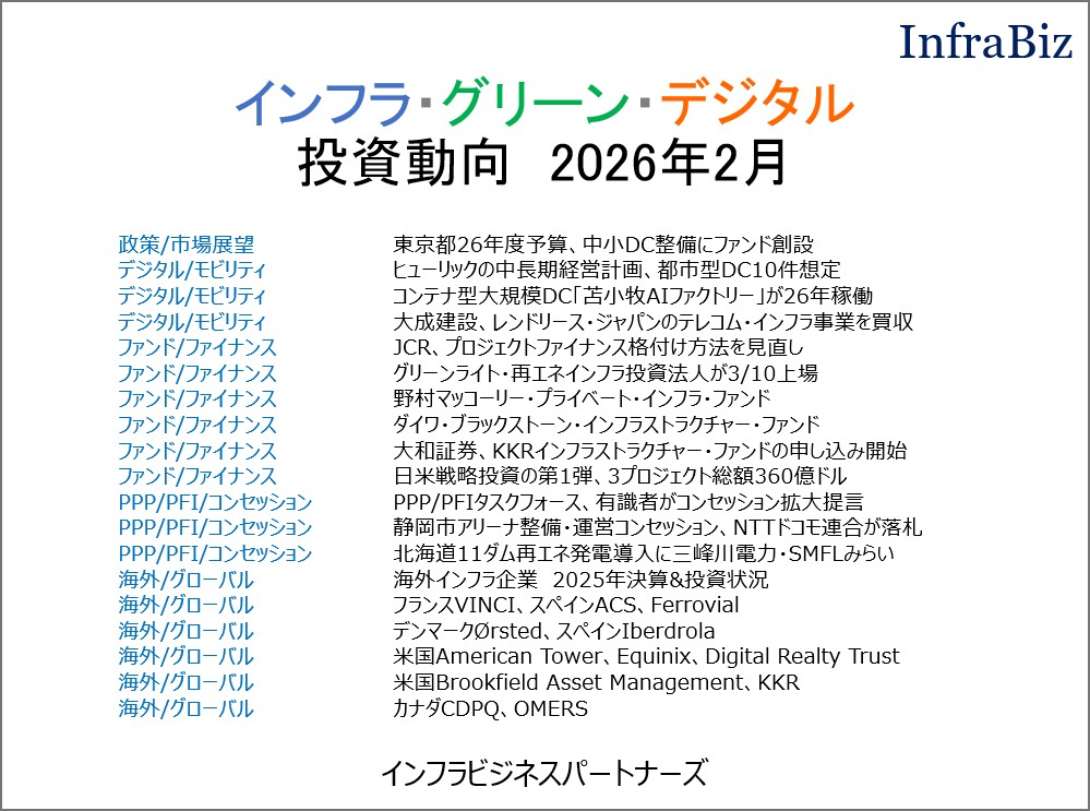 「インフラ・グリーン・デジタル投資動向」は、インフラ投資・運用戦略を立案・検証するための月次レポートです。政策/市場展望、グリーン/エネルギー、デジタル/モビリティ、ファンド/ファイナンス、PPP/PFI/コンセッション、海外/グローバル――など、分野別に重要な出来事を整理しました。