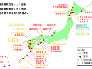 政策/市場展望 特定利用空港・港湾に青森・仙台・山口宇部空港と青森港を追加、東北初を含め40施設に 政府は2025年8月、国家安全保障戦略の一環で、平素から必要に応じて自衛隊・海上保安庁の航空機・船舶が空港・港湾を円滑に利用できるようにする「特定利用空港・港湾」に、3空港・1港湾を追加指定した。24年4月の5空港・11港湾、同年8月の3空... 2025.08.30 政策/市場展望
