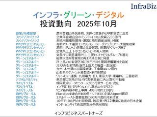 「インフラ・グリーン・デジタル投資動向」は、インフラ投資・運用戦略を立案・検証するための月次レポートです。政策/市場展望、グリーン/エネルギー、デジタル/モビリティ、ファンド/ファイナンス、PPP/PFI/コンセッション、海外/グローバル―...