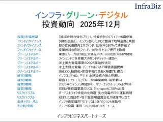 「インフラ・グリーン・デジタル投資動向」は、インフラ投資・運用戦略を立案・検証するための月次レポートです。政策/市場展望、グリーン/エネルギー、デジタル/モビリティ、ファンド/ファイナンス、PPP/PFI/コンセッション、海外/グローバル―...